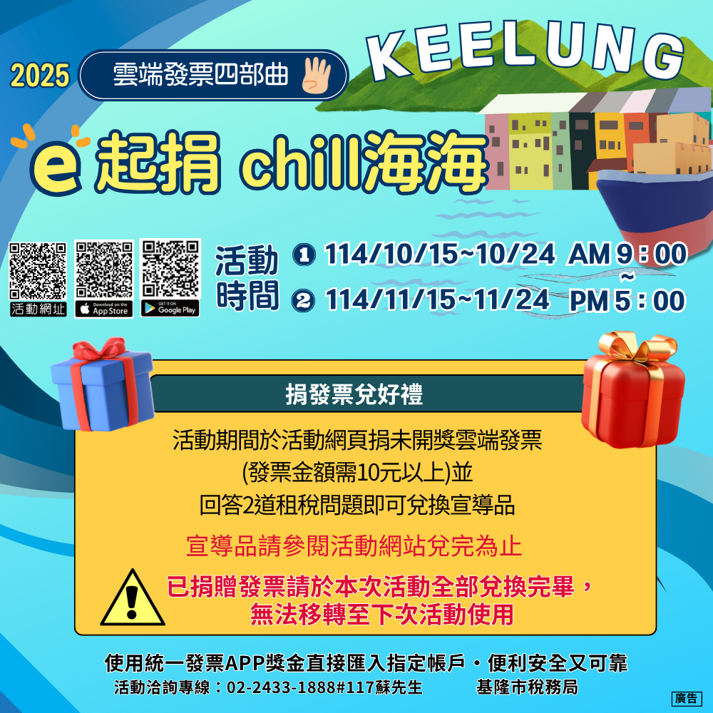 活動期間於活動網頁捐未開獎雲端發票(發票金額需10元以上)並回答2道租稅問題可參加「捐發票兌好禮」活動,宣導品兌完為止。